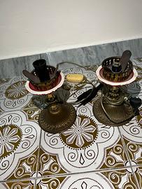 coppia di lampade da tavolo vintage originali anni ’40/’50, realizzate in ottone e ceramica. Linee eleganti e materiali di qualità, tipici del design dell’epoca, perfette per ambienti classici, retrò o per dare carattere a un arredamento moderno. Le lampade sono abbinate, stabili e decorative, ideali come abat-jour da comodino, lampade da salotto o da studio. Condizioni buone e coerenti con l’età, con normali segni del tempo che ne confermano l’autenticità.