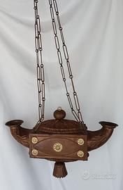 Una strepitosa e rarissima coppia di grandi lampade neoclassiche, realizzate in Veneto nel XIX secolo, in rame sbalzato a mano. Questa coppia di lampade, en pendant, sono provenienti all’origine da oratorio di villa storica e sono da ritenersi pezzi unici, realizzati su commissione, nell’ambito della grande committenza di arti applicate del XIX secolo veneto. Realizzate magistralmente a mano da maestro veneziano, sono oggetti di alto antiquariato ideale per chi cerca l’unicità e per case antiche o moderne di alto livello. Riprendono le forme delle antiche lampade da tempio di epoca romana, impreziosendo il chiaroscuro con rosette in metallo patinato oro e catene per essere appese al soffitto.