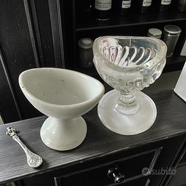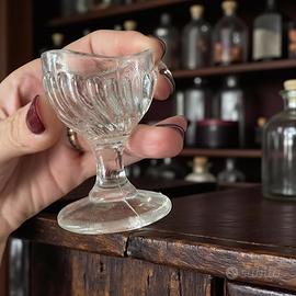 Coppia di lavaocchi primi decenni del ‘900. Materiali: vetro pressato a stampo in quattro parti + ceramica bianca smaltata. Lo stampo multiplo lascia le linee di giunzione visibili, tipiche della lavorazione a vetro pressato dell’epoca. Entrambi di piccole dimensioni, da uso personale. Condizioni: tracce d’uso e piccole irregolarità dovute alla lavorazione d’epoca. Nessuna crepa o felatura.