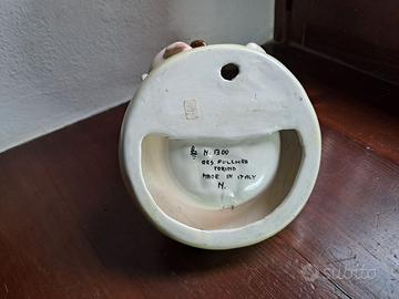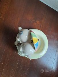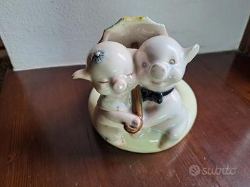 Coppia maialini su piattino con ombrello cm. 15X15 circa . Ars Pulchra Torino anni 1940 . Perfetta senza la minima sbeccatura .
