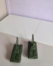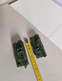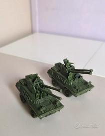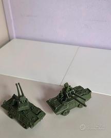 Coppia di modelli veicoli militari giocattolo vintage Atlantic Autoblindo V200 in scala HO. Questi modellini fanno parte della storica serie "Soldati d'ltalia" prodotta dall'azienda italiana Atlantic negli anni '70. Il design si basa sul veicolo blindato anfibio Cadillac Gage V-200, qui rappresentato in una versione dotata di doppio cannaone I veicoli sono realizzati in plastica verde scuro e presentano una torretta girevole. Sono inclusi i piccoli soldati visibili all'interno della torretta, che erano originariamente inclusi nel set.