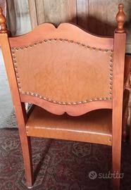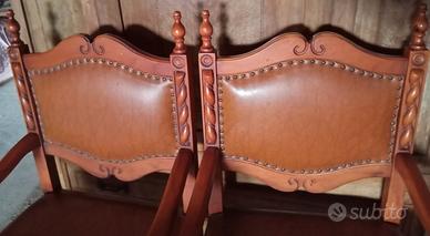 Vendo coppia di poltroncine vintage abbinate in legno massello con seduta e schienale rivestiti in similpelle color cuoio,con intagli decorativi su schienale e braccioli,in stile classico o vintage, strutturalmente solide, imbottitura