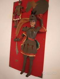 Coppia di Pupi Siciliani Bellisimi artigianali complete di armature, armi e vestiti antichi originali Misure Pannello altezza 65cm larghezza 35 cm La donna è alta 30cm, l'uomo 55 cm. circa Le condizioni vedere attentamente sono come da foto; le foto sono parte integrante della descrizione e lo stato in cui sitrovano gli oggetti.