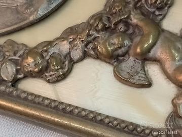 Coppia quadretti religiosi sacri Santa Chiara San Francesco puttini metallo epoca anni 50 del Novecento circa Deliziosi piccoli quadri da appoggio realizzati in metallo lavorato a tema fiori, putti, che rappresentano due famosi santi Santa Chiara e San Francesco. I due Santi sono sormontati da angeli e ghirlande floreali metallo forse ottone/ bronzo non pesante e con sfondo in simil madreperla è retro in cartone di colore bordeaux Piccole dimensioni cm 9x5 🙋🏻♀️ I DUE QUADRETTI PRESENTANO SEGNI DEL TEMPO VISIBILI NELLE FOTO E VIDEO 🙋🏻♀️