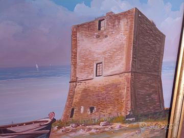 Coppia di dipinti ad olio su tela, firmati e datati 1991, raffiguranti due luoghi storici della provincia di Palermo: Torre Pozzillo e Castello di Carini.
