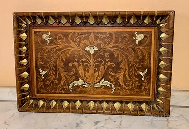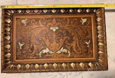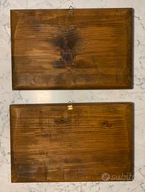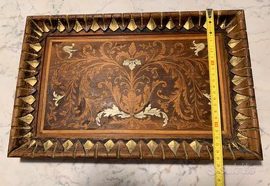 Quadri in legno massiccio intarsiati a mano. Probabilmente anni ‘50. Decori classici a foglia con legni a contrasto e pregiata cornice intagliata con motivi a punta dorati.