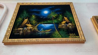 Vendo splendida coppia di quadri vintage dipinti a mano su velluto nero, firmati WISOOT, artista del Sud-Est Asiatico (probabilmente Thailandia). Le opere raffigurano scenari tropicali notturni con capanne tradizionali, palme, figure umane e riflessi lunari su un fiume calmo. Entrambe le tele sono incorniciate in eleganti cornici dorate in rilievo, pronte da appendere.