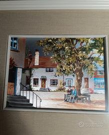 Splendida coppia di quadri vintage realizzati con tecnica di stampa su lamina metallica lucida, che dona un incredibile effetto di riflettenza e luminosità ai soggetti rappresentati. Le opere raffigurano due scene dal sapore retrò e bucolico: Vita di Paese: Un borgo fiorito con personaggi seduti all'ombra di un grande albero. Paesaggio Marittimo: Una suggestiva veduta di un porto con colline sullo sfondo. La particolarità di queste opere è la resa dei colori, che cambiano intensità a seconda dell'angolazione della luce, creando un effetto quasi tridimensionale, dalle foto del telefono non rendono. Dettagli: Materiale: Stampa su lamina metallica (effetto specchiato/argentato). Cornice: Legno laccato bianco con elegante passepartout in tessuto beige. Dimensioni totali: Larghezza 34 cm x Altezza 29 cm. Stile: Vintage / Shabby Chic / Classico. Stato: Ben conservati, pronti per decorare una parete in soggiorno, studio o corridoio per ulteriori foto e informazioni non esitate a contattarmi