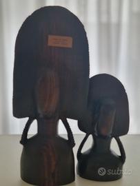coppia sculture raffiguranti eleganti teste masai finemente intagliate a mano su legno di ebano con provenienza keniota. Misurano rispettivamente cm. 30 e cm. 18 di altezza