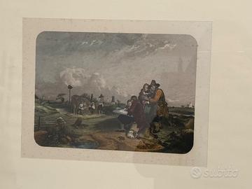 Coppia di stampe d’arte della fine del XIX secolo, ciascuna con soggetto bucolico o storico-culturale. La prima incisione, datata circa 1840, è tratta dal dipinto di Eugène Lepoittevin (1806-1870) e realizzata dall’incisore Alfred Revel (morto nel 1865). Raffigura il pittore olandese del Secolo d’Oro Paulus Potter seduto su un secchio capovolto mentre disegna una donna che munge una mucca in un paesaggio rurale.