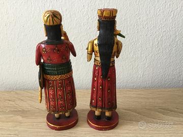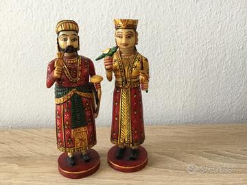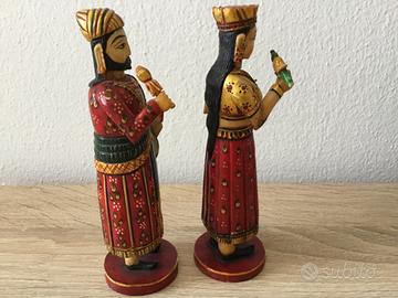 RAJASTHAN, periodo seconda metà del secolo scorso, coppia in osso di cammello, finemente dipinte ed impreziosite con pittura in oro zecchino. Raffigurano un Rajput con consorte. 13 cm. Articolo da gioielleria.il prezzo per la coppia non è trattabile.