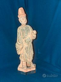 Coppia di antiche statuette funerarie cinesi in terracotta parzialmente invetriata (spinach & eggs). Dinastia Ming (periodo Hung Hsi, circa 1425 DC). Le statue facevano parte di un set da tomba di 18 pezzi, rinvenuto nella valle del fiume Li (Cina Meridionale) L'invetriatura gialla e verde è tipica del periodo e della dinastia.