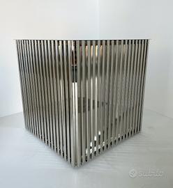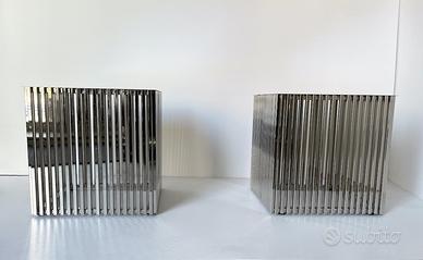 Elegante set di due tavolini o comodini Vintage design anni 70 dalla struttura cubica interamente in metallo cromato con effetto specchiato. Dimensioni: L 42 x P 42 x H 43 cm Provenienza: Italia Epoca: 1970 Il prezzo è inteso per la coppia.