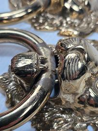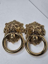 battenti o maniglie per porta portone a forma di testa di leone, in ottone massiccio lucido un accessorio architettonico testa di leone con una criniera dettagliata e un anello che pende dalla bocca, utilizzato per bussare o come maniglia è un simbolo di forza e protezione per la casa