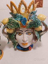 Vendo questa coppia di teste di moro in ceramica siciliana Caltagirone, in buone condizioni misure altezza 29 cm larghezza 26 cm diametro 16 cm. Provengono da una collezione di famiglia,