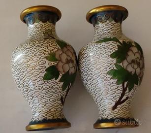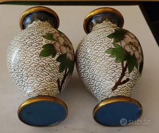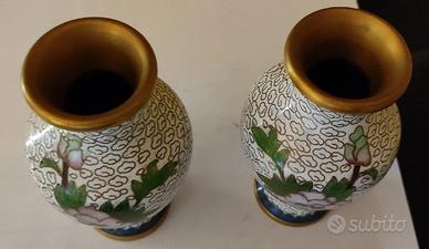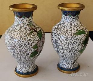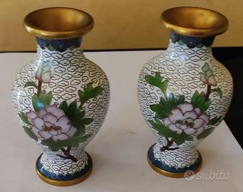 Coppia vasi cloisonné cinesi vintage - smalti e ottone - 11 cm Descrizione: Coppia di vasi rari in Cloisonné cinese originale, risalenti alla metà del XX secolo (stile Chinoiserie vintage).I vasi presentano un raffinato decoro floreale con peonie bianche e foglie verdi, realizzati con la tecnica dello smalto vitreo su base in ottone dorato. Il fondo è il classico bianco con lavorazione a "nuvolette" (cloud pattern), tipico della manifattura di qualità. Stato: Integri e perfetti, senza salti di smalto, crepe o ammaccature. Conservati in modo eccellente.Design: Coppia speculare ("mirror image"), ideali per esposizione simmetrica su mensole o camini. Dimensioni: Altezza 11 cm | Diametro 6 cm.Peso: 238 gr (la coppia). Dettagli: Interno e base rifiniti nel tipico smalto blu turchese.