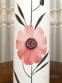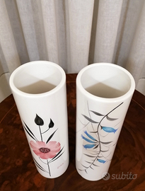 Coppia di Vasi cilindrici in Ceramica della Manifattura Jones di Nove di Bassano. La Storica ditta ha chiuso la produzione definitivamente una ventina di anni fa', quindi le Ceramiche con questo Marchio sono difficilmente reperibili. In Buone Condizioni ( hanno solo entrambi una piccola scheggiatura sul fondo che risulta quindi essere quasi invisibile). Altra particolarità, ( quello colorato in Celeste è stato dipinto alla rovescia). Numerati sul fondo. Datazione anni 70.