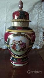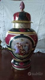 Coppia di Vasi Viennesi 1800. Potiche con coperchio in porcellana con un importante impianto decorativo a tutto tondo impostato sull’alternarsi di tableaux e riquadri nei colori del rosso del verde e del giallo. Nel fronte due inserti ovali contengono delle scene allegoriche con vestali e amorini in un paesaggio agreste. Ogni campitura è arricchita da una fitta decorazione in oro. Sotto il marchio della manifattura imperiale di Vienna in uso sino al 1864. Altezza 45 cm Larghezza 23 cm. Collezione privata. Naturalmente punzonati a fuoco marchio blu che certifica l'originalità. Vedere altri coppie vasi da antiquari in vendita a 6000€. Uguali. Antiquariato Ghilli Milano poi Antiquariato Pomono ecc. Il prezzo è leggermente trattabile in sede di visione.