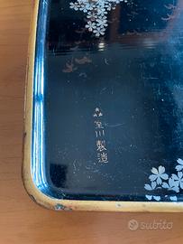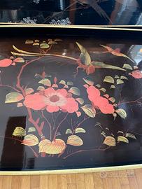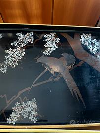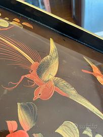 Coppia di vassoi vintage giapponesi in legno pressato, decorati con soggetti floreali e uccelli esotici su fondo nero. Le superfici sono laccate e dipinte a mano con dettagli raffinati, tipici dello stile decorativo giapponese del dopoguerra.