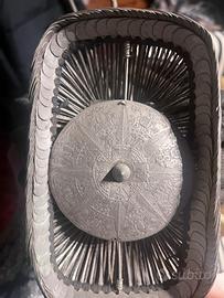 “Copricapo tribale Dao” proveniente dalla zona di Tam Duong, Vietnam .È un copricapo cerimoniale / da parata, composto da una struttura a corde intrecciate e una placca metallica centrale incisa. Due “battecche” fissano la placca alla struttura del copricapo. Sicuramente questo copricapo veniva usato per occasioni rituali o festive oppure come segno di status.