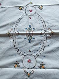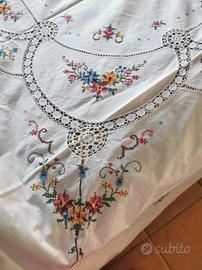 Copriletto di cotone alta qualità con disegni floreali ricamato a punto croce, a mano. Pizzi e merletti e bordo smerlato, risaltano la sua complessa e dettagliata lavorazione . Misure : 2,56x2,25 metri. Ovviamente da lavare, a causa di diverse macchie da ingiallimento come da ultime foto. Un pezzo favoloso di corredo familiare