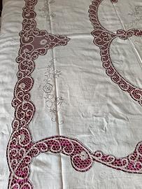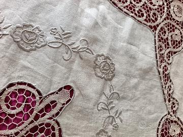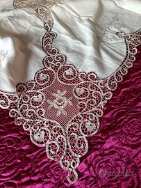 pregiato copriletto in puro lino e merletto di Cantù, corredo vintage anni 50. Misure 266 x 230 cm. Ricami e merletto realizzati a mano. Mai utilizzato, in perfette condizioni.