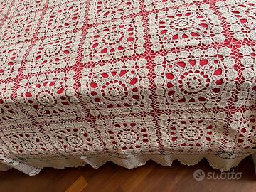 Copriletto matrimoniale o grande tovaglia in cotone di colore ecrù,ad uncinetto,quadrotti con stella centrale contornata di stelline esagonali.