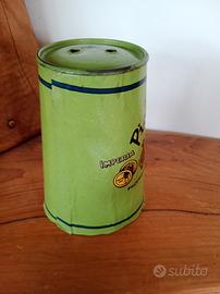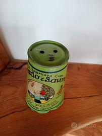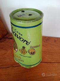 Condizioni visibili nelle foto, cartone e metallo. Altezza 14 cm, larghezza max diametro 9cm circa, larghezza min diametro 7cm.