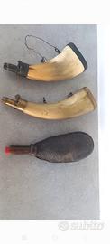 2 corni avancarica per polvere e un'aNTICA SACCA per pallini VUOTI per collezionisti o per manifestazioni storiche e anche per appassionati di militaria