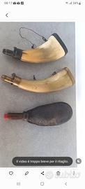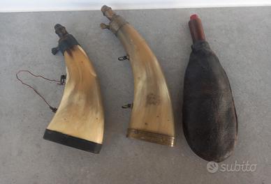 i corni nell'immagine sono corni da polvere da sparo, uncontenitore utilizzato per conservare e dosare la polvere da sparo per armi ad avancarica, come moschetti e pistole a pietra focaia.