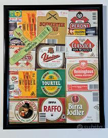 Cornice in legno e vetro in ottimo stato con una variegata e affascinante collezione di etichette di birra, risalenti agli anni 90 del secolo scorso. Perfette per collezionisti o progetti vintage, queste etichette rappresentano birre iconiche da diversi paesi.