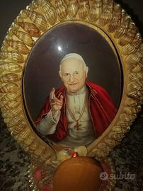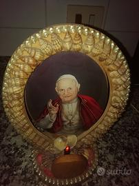 Vendo foto con cornice in legno e bordi con conchiglie di Papa Giovanni xxiii(papa buono),c è una piccola luce davanti alla foto con presa di corrente.Altezza cm.25. Euro 15.