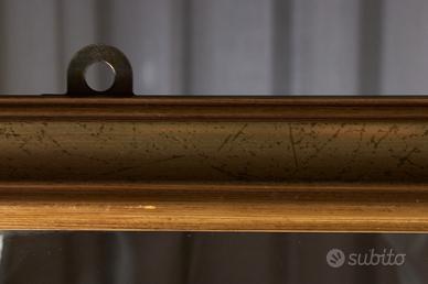 ◆ Cornice in legno con finitura dorata, dal gusto classico, pensata originariamente per accogliere un elemento centrale oggi non identificabile come specchio funzionale. Il vetro è integro e montato all’interno della cornice.