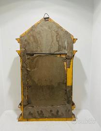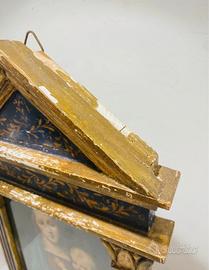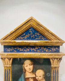 Vendo edicola in legno del XIX secolo, dipinto di blu e oro, che ricorda un tempio. Al centro si trova un'incisione colorata a mano raffigurante la Vergine col Bambino, ispirata a