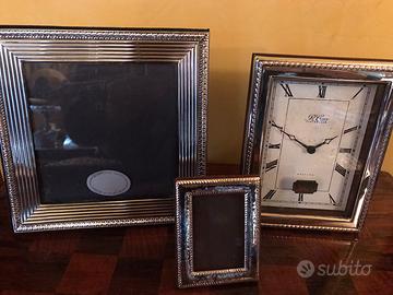 Cornici, orologio da tavolo, scatolina portagioie e rubrica in argento inglesi 5 pezzi vintage