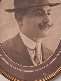 Cornice ovale anni ’30-’40, completa di fotografia coeva raffigurante un uomo elegante con cappello e baffi, ritratto con taglio tipico dell’epoca.