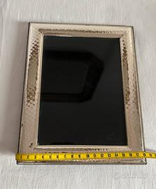 Splendida cornice portafoto fatta a mano, realizzata in Italia, con struttura in tessuto scamosciato blu scuro e cornice frontale placcata argento con motivo dettagliato, vetro per proteggere la foto.