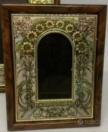Questa cornice ha struttura in legno effetto radica. L'interno ha una ricca e minuziosa lavorazione a sbalzo di volute, foglie, piccoli fiori dai colori pastello su fondo argento satinato