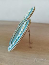Cornice portafoto antica, realizzata in Italia in stile Liberty alla fine del XIX secolo (esattamente intorno al 1880), a forma di tavolazza di pittori. Estremamente rara e preziosa, in ottone dorato e micro mosaico composto da centinaia di minuscole tessere di vetro colorato (pasta vitrea) di Murano che formano uno splendido motivo floreale in rilievo (numerosi piccoli fiori e foglie).