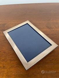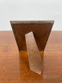 Cornice portafoto da tavolo in argento titolo 800, punzonata 338 FI, produzione italiana. Design classico e senza tempo, ideale per arredare casa, studio o ufficio. Perfetta anche come idea regalo. Il fronte è rivestito in argento 800, mentre il retro e il supporto sono in legno con cavalletto inclinabile. Caratteristiche Dimensioni esterne: 17,5 x 12,5 cm Formato foto indicativo: circa 13 x 18 cm Peso cornice (senza vetro e retro): 45 g complessivi Condizioni Ottime condizioni generali, con normali segni del tempo. Argento in buono stato, pronto all’uso.