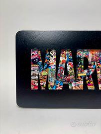Vendo cornice decorativa in legno di colore nero con all’interno la scritta MARVEL realizzata in plexiglass ad alta qualità, stampata con tecnologia digitale che mostra una vivace composizione di fumetti originali.