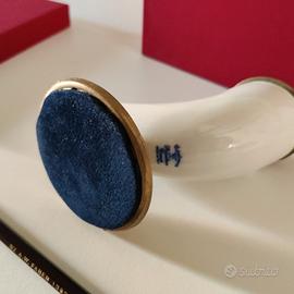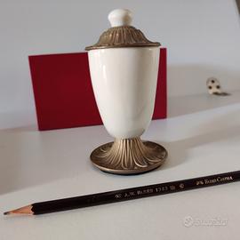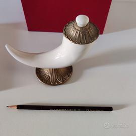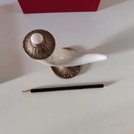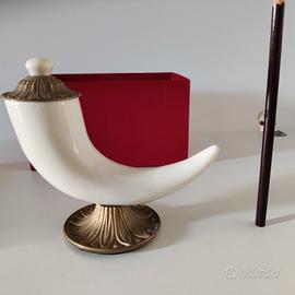 Questo oggetto di arredo, tipico della tradizione napoletana, di marchio “La Lumiere”, è di ottone e porcellana di Capodimonte . E’ completo di certificazione e non è mai stato usato o esposto. E’ contenuto nella sua confezione originale, un elegante scatola rossa. E’ largo 15 cm, alto 13 e profondo 5. Peso 280 g. Prezzo originale 75 euro, lo vendo per 40
