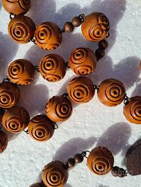 Corona del Rosario, in legno, gigante, a 6 decine. Ogni sfera ha un diametro di 2 cm. La croce misura 8,5 x 5 cm. La lunghezza totale della parte con le decine, aperta, è 160 cm.