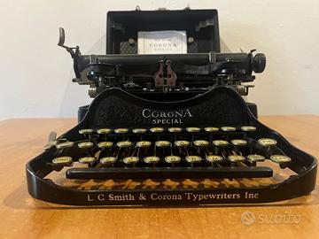 La *Corona Special LC Smith 10/20* è una macchina da scrivere portatile degli anni '20, dal design essenziale e funzionale. Il suo corpo in *metallo nero opaco*, privo di rifiniture decorative, le conferisce un aspetto sobrio ma elegante.