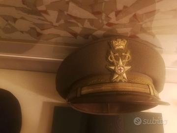 1) Berretto, manifattura Geri Alfa, Montevarchi. Realizzato in cordellino kaki, con fascia damascata e fregio ricamato in canutiglia oro su panno kaki. Il fregio è costituito da una stella a cinque punte sormontata da una corona turrita con due bastoni caducei. Al centro, un tondino bianco con una croce rossa. Visiera in plastica ricoperta di pelle. Diametro di appoggio sulla testa cm 17.