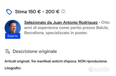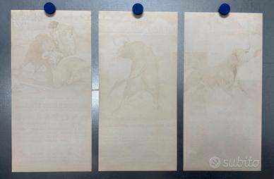 Propongo un eccezionale lotto di tre manifesti originali delle storiche Corridas Generales di Bilbao per le annate 1971, 1972 e 1973. Si tratta di autentiche litografie d’epoca d'altissima qualità stampate dalla rinomata Litografía Ortega di Valencia e firmate dall'illustratore Andrés Martínez de León. I manifesti presentano colori vividi e uno stato di conservazione eccellente (Grado A) senza fori di puntine o nastro adesivo sul retro, dettaglio rarissimo per affissioni di oltre cinquant'anni fa. Il valore di questo set è stato stimato da esperti del settore tra i 150 e i 200 euro, rendendo questo acquisto un vero investimento oltre che un ricercato pezzo d'arredo vintage. All'interno si trovano nomi leggendari della tauromachia come El Cordobés e Paquirri, perfetti per dare un tocco di eleganza retrò e storia a qualsiasi ambiente. Garantisco una spedizione estremamente curata all'interno di un tubo di cartone rigido protettivo per preservare la perfetta integrità delle opere.misure 45x22