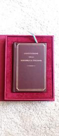 Riproduzione integrale del testo della Costituzione della Repubblica Italiana approvato dall'Assemblea Costituente il 22 dicembre 1947 e pubblicato sulla Gazzetta Ufficiale N. 298 del 28 dicembre 1947. Cofanetto in tela con applicazione del logo ufficiale delle Celebrazioni del 150° anniversario dell'Unità d'Italia, coniato in metallo, laminato in oro giallo 18 carati con incisione a laser e smalto a caldo in cinque colori levigato e lucidato interamente a mano.