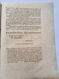 Rara costituzione pontificia originale del 1742, emanata da Benedetto XIV (Prospero Lambertini), stampata a Roma presso la Tipografia della Camera Apostolica. Documento ufficiale di diritto canonico relativo all’esecuzione di citazioni e provvedimenti della Curia Romana. Frontespizio con stemma pontificio e figure xilografiche, carta vergata settecentesca. Buone condizioni generali con normali segni del tempo. Documento autentico del XVIII secolo, ideale per collezionisti di diritto canonico, storia ecclesiastica e documenti pontifici.