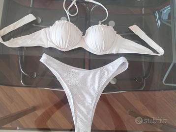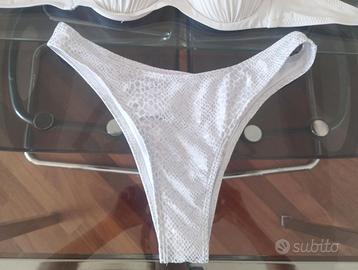 Vendo costume da bagno bikini brand Shein composto da pezzo di sopra bianco modello a conchiglia con laccetti e il sotto abbinato luminoso, taglia S.
