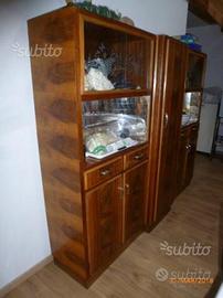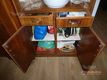 credenza color ciliegio in legno massello impiallacciato dimensioni 215x40xH175 cm costituita da tre moduli di cui due laterali di 82 cm e uno centrale di 51cm, la parte centrale ha tre ripiani e nell'anta è ricavato un vano portabottiglie con tre ripiani, lateralmente nella parte bassa ci sono 4 ante con ripiani e 4 cassetti, il vano a giorno è abbellito dalla forma arcuata composta da piccoli specchi, la parte alta due vani a giorno con vetri incisi scorrevoli, il tutto è originale e ben tenuto, il mobile si divide in tre parti per il trasporto.